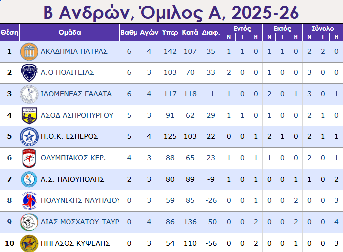 ΑΚΑΔΗΜΙΑ ΤΩΝ ΣΠΟΡ ΠΑΤΡΑΣ: [Γιάννης Παπαγιαννόπουλος], Σαρίκας 4, Σπανός, Αλ.Παπαγιαννόπουλος 11, Κολιούλης 3, Γεωργίου 1, Αγγελακόπουλος, Μαργαζάς, Μακρυδάκης, Παπαδιονυσόπουλος, Σκόνδρας, Παπακωστόπουλος 6, Γιαννακούρας 5, Αιβάζης 2, Ψυχογιάννης, Δεμίρης, Σμυρνιώτης 2.