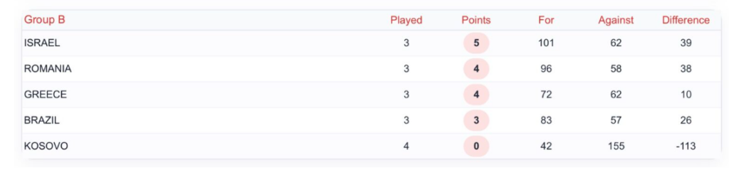 23/4: Ελλάδα – Κόσοβο 23-12, Ρουμανία-Βραζιλία 22-22, Κόσσοβο-Ισραήλ 12-46.
