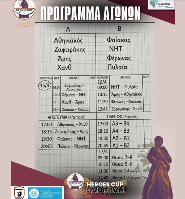 Ξεκινάει αύριο στην Νάουσα το Heroes Cup 2026 (15–16–17 Απριλίου) που διοργανώνει ο Ζαφειράκης Νάουσας με την βοήθεια του Δήμου της Ηρωικής Πόλης Νάουσας, υπο την αιγίδα της ΟΧΕ και τη συμμετοχή 8 ομάδων από όλη την Ελλάδα στη κατηγορία Παμπαίδες Α’ (U14):