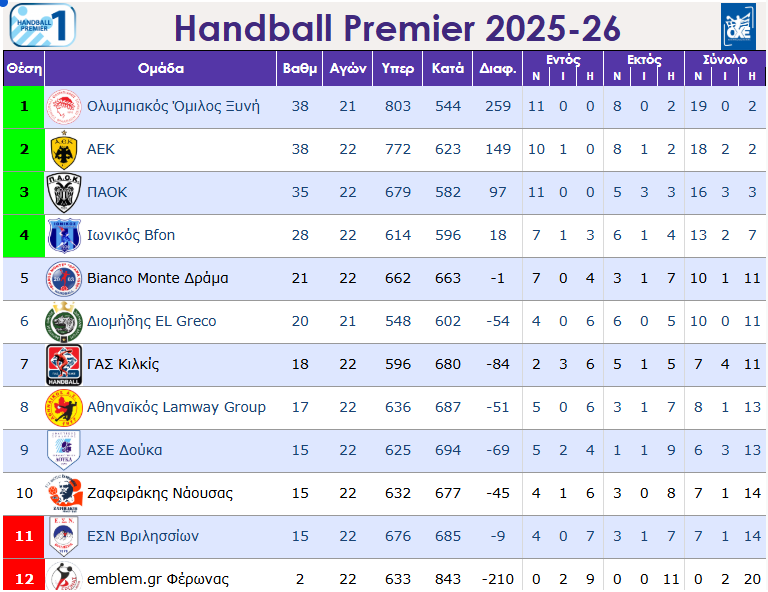 Αύριο Μεγάλη Τετάρτη 8 Απριλίου 2026 με τον αγώνα Διομήδης Άργους Ολυμπιακός Όμιλος Ξυνή στη Νέα Κίο, τελειώνει η κανονική διάρκεια της Handball Premier, κεκλεισμένων των θυρών λόγω της ποινής που έχει επιβάλλει η Αθλητικός Δικαστής.