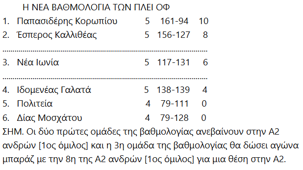 Η Νέα Ιωνία νίκησε στο κλειστό της Κλαδισού τον Ιδομενέα με 33-24 και μπήκε με το δεξί στα πλει οφ της Β΄Εθνικής για μιά θέση στην Α2 ανδρών. Όπως είναι γνωστό ανεβαίνουν στην Α2 [1ος όμιλος] οι δύο πρώτες ομάδες ενώ η 3η της βαθμολογίας θα δώσει αγώνα μπαράζ με την 8η της Α2 ανδρών,