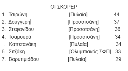 Η Παναγιώτα Τσιρώνη με τα 13 γκολ που έβαλε σήμερα με τον Ολυμπιακό αναδείχθηκε πρώτη σκορερ με 44 γκολ.