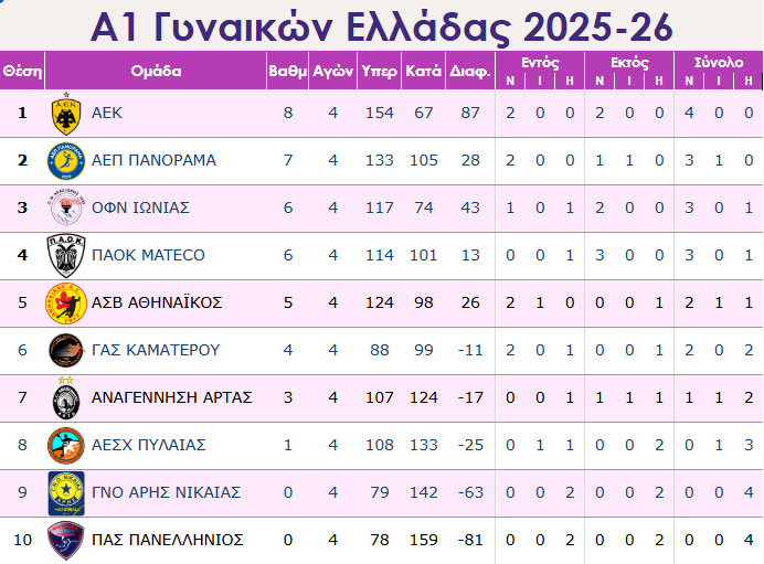 Η ΑΕΚ νίκησε στις Συκιές με 45-13 την νεοφώτιστη ομάδα του Πανελλήνιου Νεάπολης για την 4η αγωνιστική της Α1 γυναικών και έκανε το 4Χ4 παραμένοντας μόνη της στην κορυφή της βαθμολογίας, ανανεώνοντας το επιθετικό της ρεκορ που ήταν 44 γκολ με τον Άρη Νίκαιας.