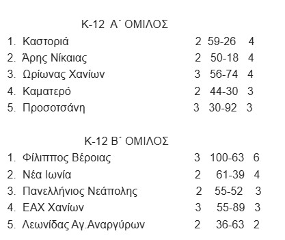 Κ-12 Α΄ ΟΜΙΛΟΣ: Άρης Νίκαιας-Καματερό 15-11, Καστοριά-Προσοτσάνη 33-9, Καστοριά-Ωρίωνας Χανίων 27-17, Ωρίωνας Χανίων-Προσοτσάνη 24-14.